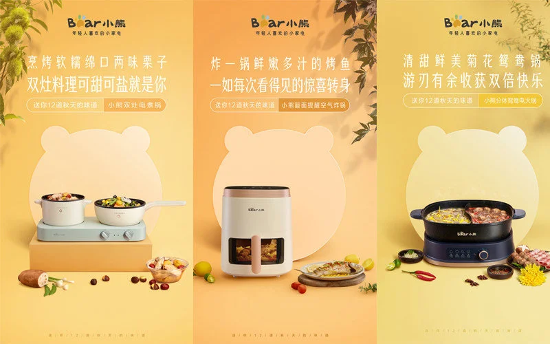 為此,小熊電器將產(chǎn)品與自然結(jié)合,融入日常生活場(chǎng)景,打造一場(chǎng)「大地食裝秀」,為用戶獻(xiàn)上12道秋天的味道,通過(guò)產(chǎn)品的顏值、細(xì)節(jié)、功能呼應(yīng)年輕群體對(duì)于精致生活的追求,既貼合產(chǎn)品功能屬性,又巧妙融入場(chǎng)景,讓產(chǎn)品刷足“存在感”,解鎖了場(chǎng)景的“體驗(yàn)感”,更傳遞著輕松有質(zhì)感的生活方式與體驗(yàn),加碼小熊電器 “治愈”“有溫度”的品牌認(rèn)知。
