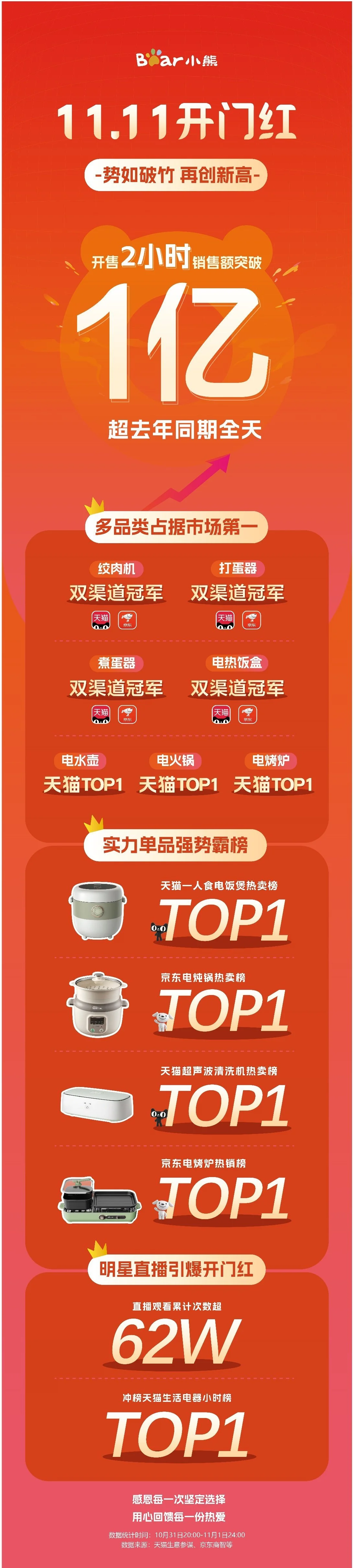 開門紅僅僅兩小時(shí)銷售額便破億,實(shí)現(xiàn)聲量銷量齊漲。與此同時(shí),多品類在天貓、京東全渠道平臺(tái)持續(xù)引爆,包攬各大榜單榜首,其中小熊絞肉機(jī)、打蛋器、煮蛋器、電熱飯盒斬獲在天貓、京東雙渠道TOP1,電水壺、電烤鍋、電烤爐位列天貓渠道TOP1,空氣炸鍋登頂天貓熱銷榜單TOP1。11月1日,小熊電器更是通過明星直播繼續(xù)引爆雙十一搶購熱潮,直播當(dāng)即沖上天貓生活電器小時(shí)榜TOP1。